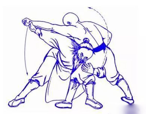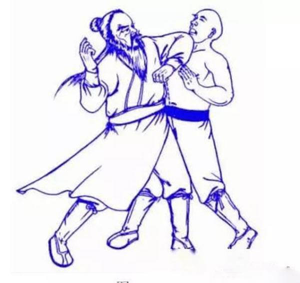 3.动作不停。我方在托住敌方右臂之际,左脚迅疾向敌方洪门踏进,左肘推击敌方咽喉。