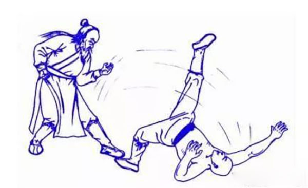 4.在敌方咽喉受击,尚未退避得开的刹那,我方左手向敌方裆部抓击,抓住后猛力转腕上提,将敌方掀翻在地。