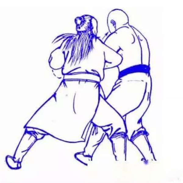 3.我方右掌格住敌左腕之际即扣指抓住,并向右后侧牵带,同时,右脚后撤一步,左脚上步于敌方裆前,前俯身左臂捞抱住敌方左大腿。