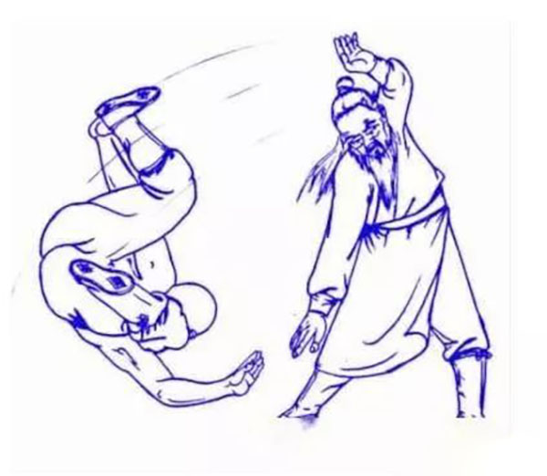 4.我方立身而起将敌方扛在肩上,迅速向右侧甩出,使其头下脚上坠跌。