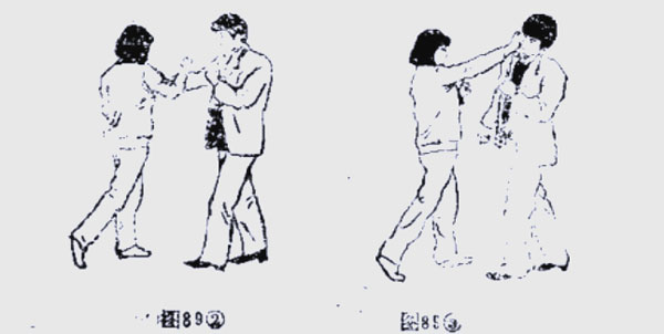 紧接上势,在歹徒右掌回收的瞬间,女方右拳迅速向前横摆,以拳背精准点击其面部右侧,从而使其陷入被动(图89)。