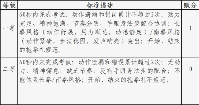 根据考生完成动作时的整体表现判定考生演练水平的等级,并按相应等级对应的分值赋分。一等赋1分、二等赋0分。