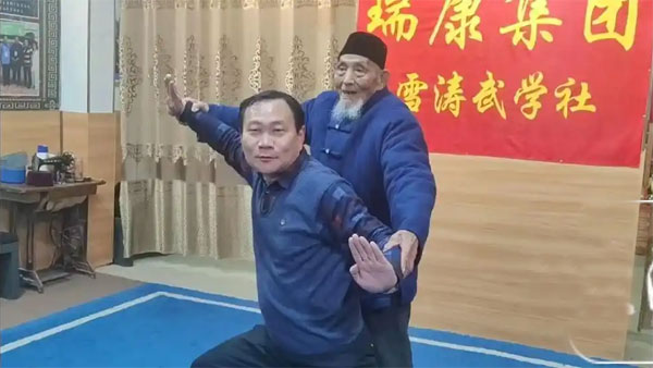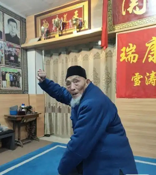 2月24日下午,大皖新闻记者来到位于蚌埠市蚌山区金鼎皇庄小区内的的雪涛武学社,一位身着藏蓝色对襟衫,头戴武术帽的白胡子老人已在门口等候,双眼炯炯有神。雪涛武学社负责人张雪涛告诉大皖新闻记者,这位老人就是马同保,今年已95岁高龄。
