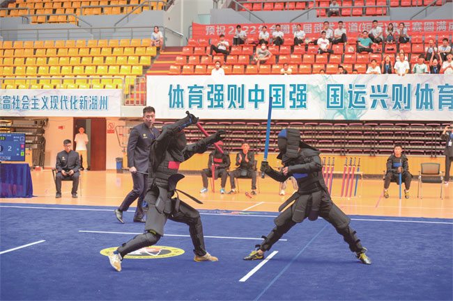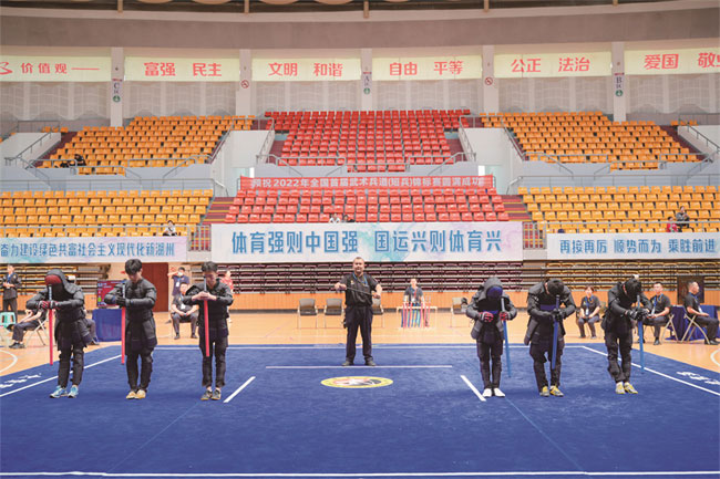 手中有兵,心中有礼。武术兵道的吸引力不仅在于让武术回归对抗的本质,还在于它将中国传统人文精神与现代体育价值观在武术中巧妙融合。国家武术兵道队总教练、湖州师范体育学院教授文善恬说:“武术兵道是中国武术以持兵器为特征的现代武术项目,既能学习武术的经典动作,又能展现中国文化,使得文武两道相得益彰。”为了体现出中国传统,体育总局武术中心在兵道器材、装备及礼仪文化方面做了大量革新和探索。