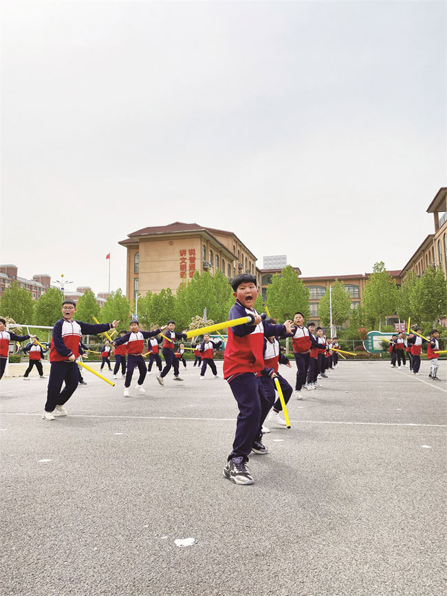 从此扶沟陈炳太极院里,常能看到学员们一动一静两种武术模式交相练习。为了尽快把武术兵道在扶沟县里铺陈开,也为了广大学生能尽早从中受益,感受到中国传统武术的魅力,刘军伟主动联系学校,开展义务教学。他先是走进金海路实验小学,开展每周两节的兵道社团课,后又觉得自己的力量太小,需要培训一批体育老师当兵道教练,借助他们的力量,让兵道扎根校园。