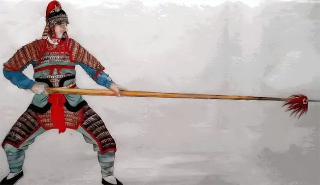 马步端枪右胯一颠拧腰出枪。在出枪时后腿窝挺起时,也就是枪头到达终点的时候,一定要找这个合。力合时枪头就会颤动[注意后脚不要拔跟]