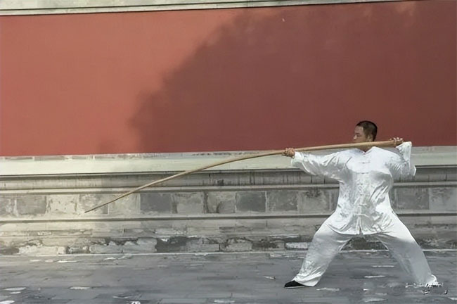 内扫抖 双手于腹前水平握持大杆,左手在前右手在后,左手向右前方水平发力抖动,右手向左后方平拉,形成争力,腰胯短促向右发力,反复练习。