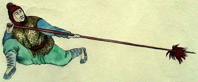 外扫抖 左手在前握持大杆,向左前方水平发力抖动,右手向右前方推动杆尾,形成争力。腰胯向左转,协同发力。反复练习。